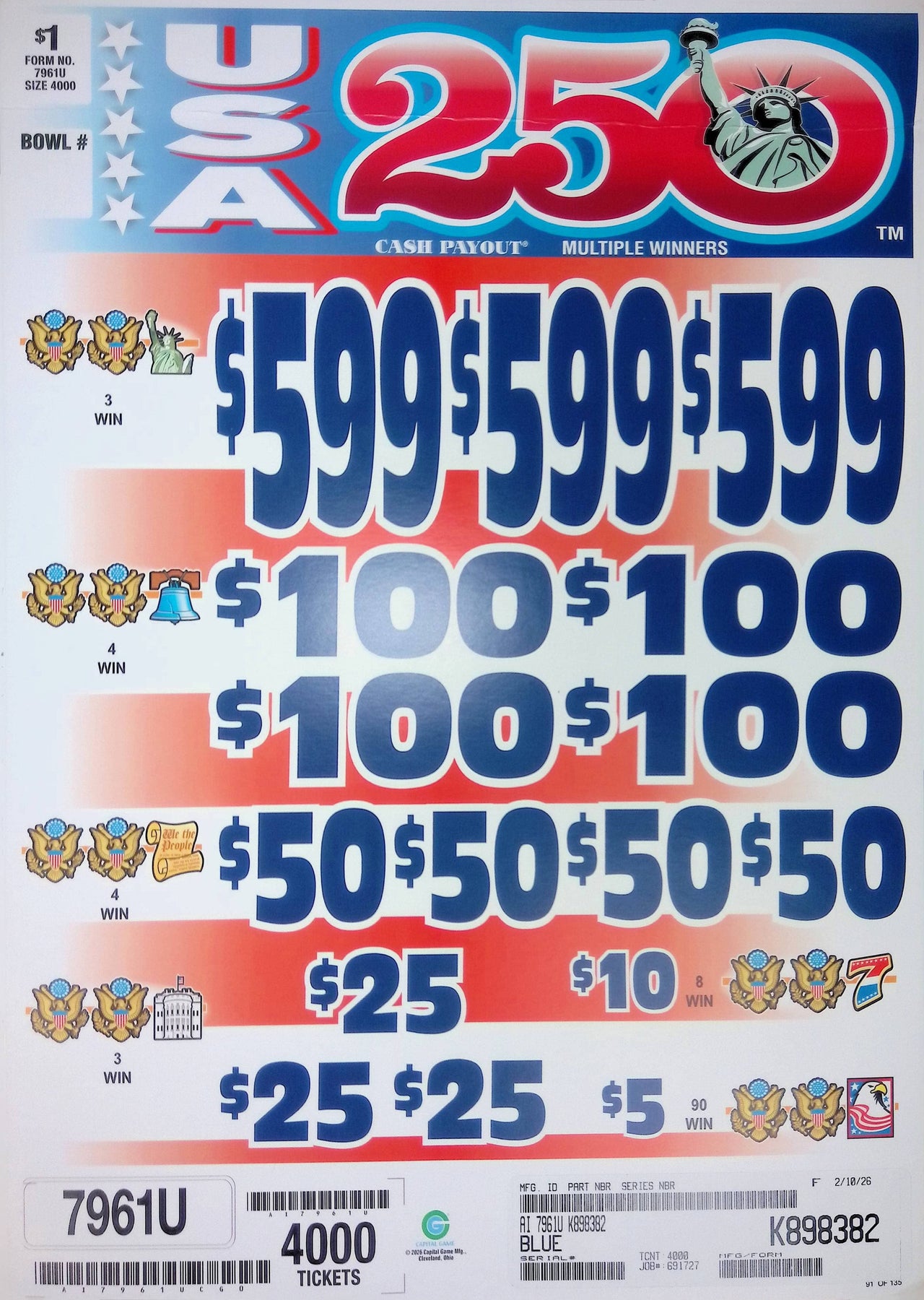3 Top Winners @ $599 $5 Bottom 75% Payout 25% Ideal Profit 3 Window $1 Ticket